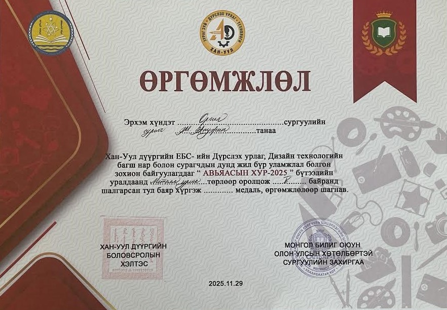 2025 оны 11 сарын 29-нд явагдсан Хан-Уул дүүргийн ЕБС-ийн багш, сурагчдын дунд жил бүр зохион байгуулагддаг “Авьяасын хур-2025” бүтээлийн уралдааны модон урлалын төрөлд 10-1 ангийн сурагч Ж.Урангоо тэргүүн байр, металл урлал болон зураасан зургийн төрөлд 11-1 ангийн сурагч М.Анужин 5-р байр эзэллээ.